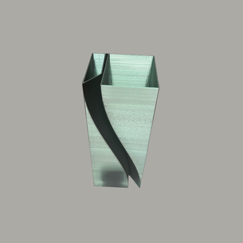 Vaza „Dvilypė elegancija“ – tai modernus kūrinys, kuriame susilieja geometrinė forma ir subtilus spalvų žaismas. Kampuota konstrukcija su išskirtine banguojančia juosta pabrėžia dinamišką dizainą, o sukant vazą spalvos keičiasi – iš vieno kampo ji atrodo metalinė žalsva, iš kito – su ryškiu juodu akcentu. Pagaminta 3D spausdintuvu iš ekologiško PLA plastiko, ši vaza taps išskirtiniu akcentu Jūsų interjere.