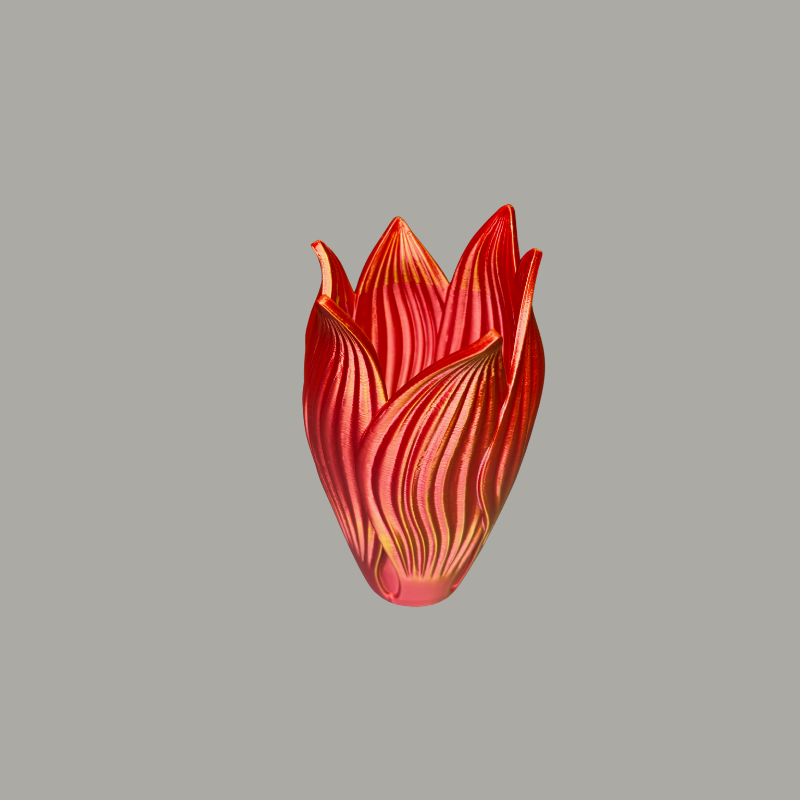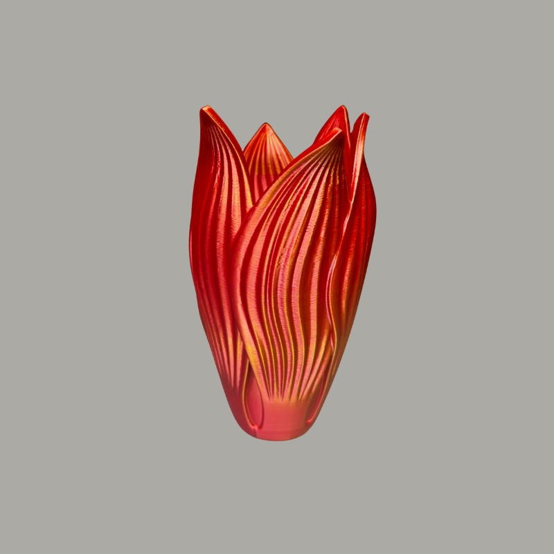 Vaza „Raudona Tulpė“ – elegantiška ir išraiškinga interjero detalė, įkvėpta tulpės žiedo formos. Banguoti kraštai primena natūraliai prasiskleidusius žiedlapius, o raudonai-geltoni perėjimai sukuria liepsnos efektą. Pagaminta 3D spausdintuvu iš ekologiško PLA plastiko.